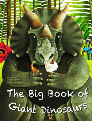 “A separate small hardcover volume about small dinosaurs nestles in the front cover of a much, much larger album of their humongous cousins. Each part of this Italian import features 18 spread-filling dinosaurs in side views, tricked out by Cosanti in loud, saturated colors or patterns and posed for scale with a remarkably calm white chicken against the same tropical backdrop. The effect is a bit surreal, as the dinos and the prehistoric foliage have the thick, rounded look and fuzzy surfaces of stuffed toys, but the weight and bulk of the looming creatures in the super oversized volume—and the lithe grace of most of their often feathered smaller relatives in the diminutive one—do come through vividly enough to make strong impressions on viewers. Each portrait comes with an identifying label and a descriptive comment….even expert dinophiles are likely to find mixed in with the usual suspects a surprising number of unfamiliar species, such as Magnapaulia, Therizinosaurus, and Parvicursor. Unwieldy for library use; just right for little hands and big (really big) laps. (Informational picture book. 6-9)”